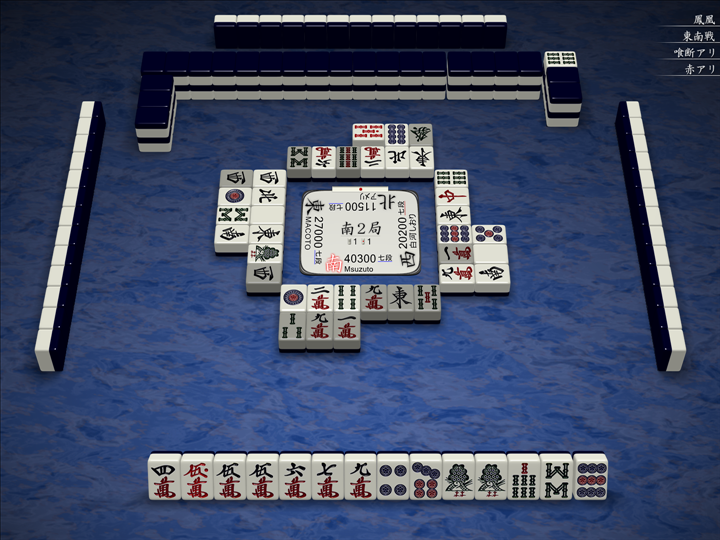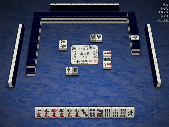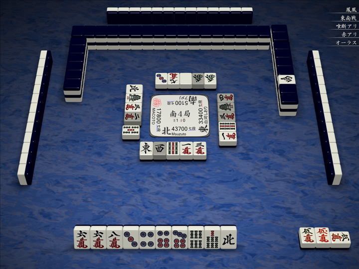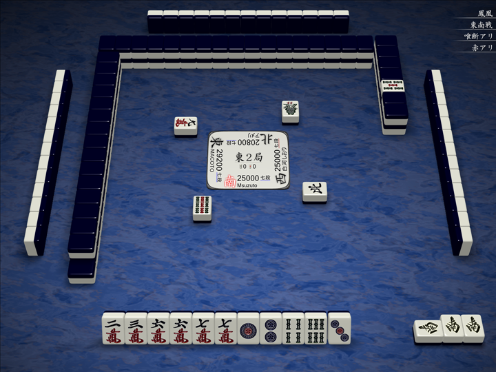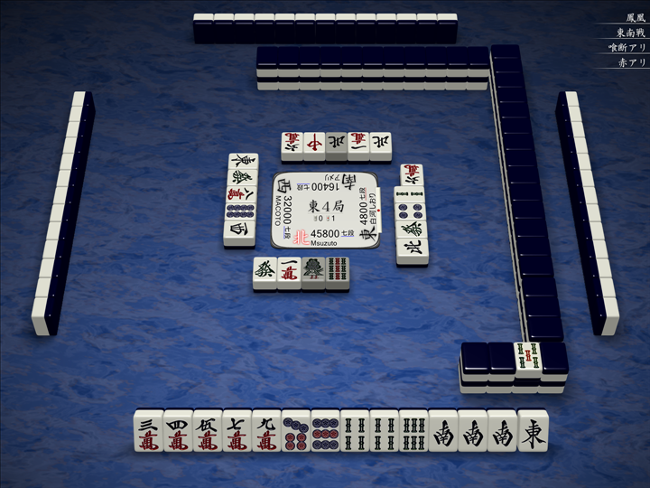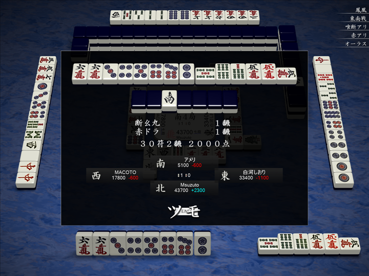 で私への放銃となってしまいました。点数こそ2,900(+300)点と安いですが、私にとってはありがたいアガリでした。なんで