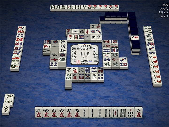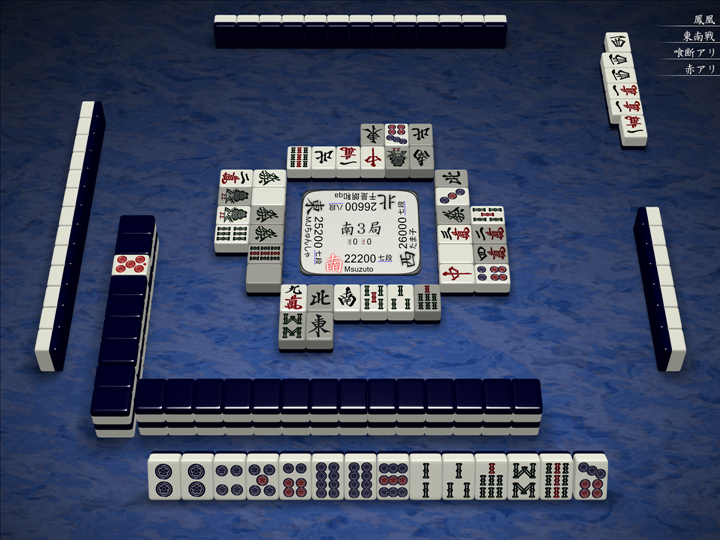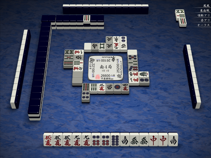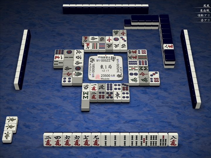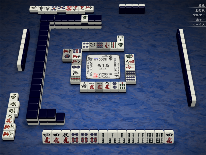 実戦ではこんな感じで、3人テンパイで流局でした。対面の待ち牌の